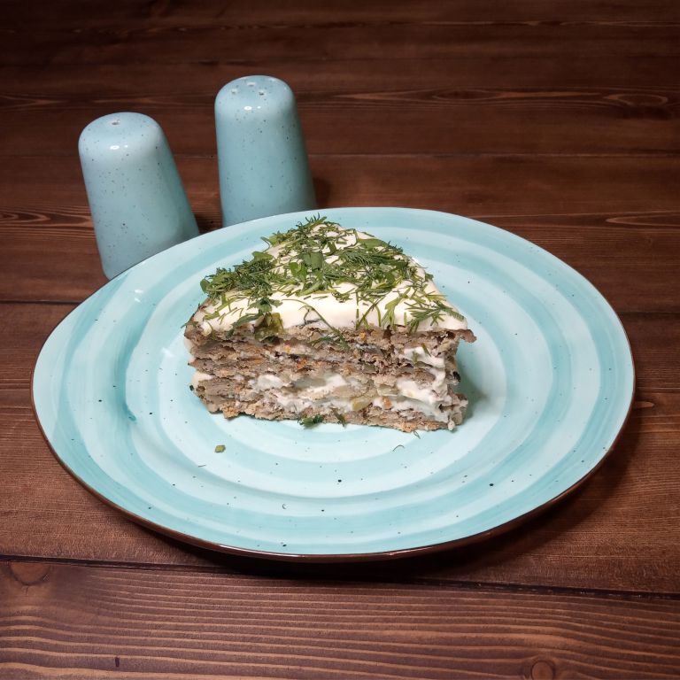 Торт печеночный с грибами и омлетом